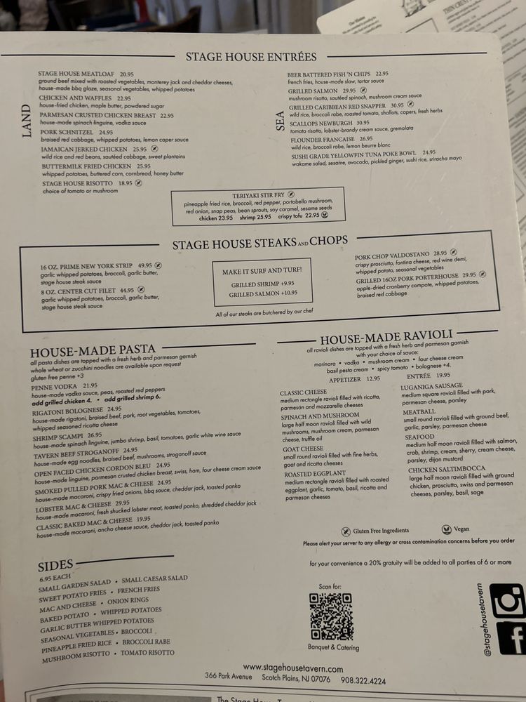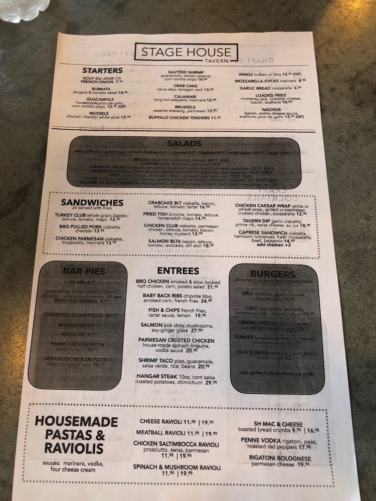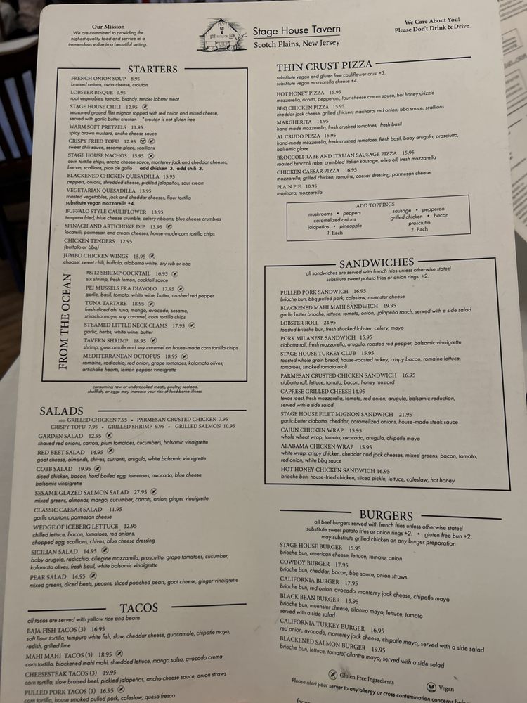 Stage House Tavern, located in Scotch Plains, NJ, is a versatile dining option offering a variety of mouth-watering dishes. This American pub specializes in salads, perfect for those looking for a lighter meal. With the convenience of taking reservations, delivery, and takeout options, Stage House Tavern caters to a range of dietary needs. The establishment is wheelchair accessible and accepts various payment methods, including cryptocurrency. Enjoy the relaxed atmosphere with moderate noise levels, outdoor seating, and free Wi-Fi. Additionally, live music and a full bar provide entertainment on select nights. Whether you're looking to dine in or host a group event, Stage House Tavern has something for everyone. Make sure to check out their pool table, heated outdoor seating, and dog-friendly environment. Experience a taste of diverse flavors and excellent service at Stage House Tavern.